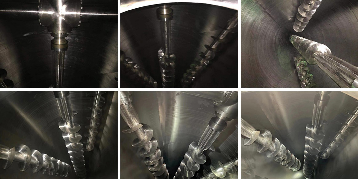 混合机三条螺旋(二条对称排列螺旋及中间一条长螺旋)的快速自转,将物料向上提升,形成三股沿筒壁自下向上的螺柱形物料流,长螺旋运转解决了中间物料混合的盲区及底部死角,