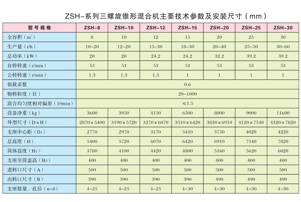 注:创新改进型ZSH三螺旋锥形混合机:2、3、4、5、6(m³)可按用户要求定制,有关尺寸以双螺旋尺寸为准。