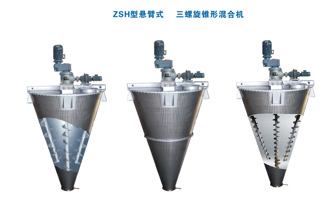 锥形三螺旋混合机(8m³以上):在原双螺旋锥形混合机基础上系统进行创新改进,增加一条螺旋,采用两条对称排列螺旋及中间一条长螺旋(叶片加大)运转,原长螺旋斜度大、压力大、今缩短螺旋长度牢固,增加螺旋的强度,使得三条螺旋比现有的双螺旋运行更加的稳定,螺旋越多,混合效果越明显,解决了中间物料搅拌的盲区及死角,底部物料不断往上提升,混合精度更高,提高生产率,保证质量,使设备寿命增长。采用该系列机提升混合效果,解决了用户对特轻、特细等物料难以混合均匀的困难,对密度大等物料更加适用,同时对一般物料速度、精度均有明显提高,减少混合时间,具有节能意义。